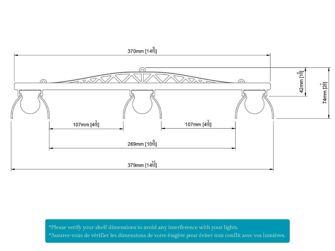 Bien que les supports soient compatibles avec la majorité des étagères, veuillez vérifier l’espacement des lumières illustré sur les photos afin de vous assurer qu’elles ne rentrent pas en conflit avec votre structure d’étagère.